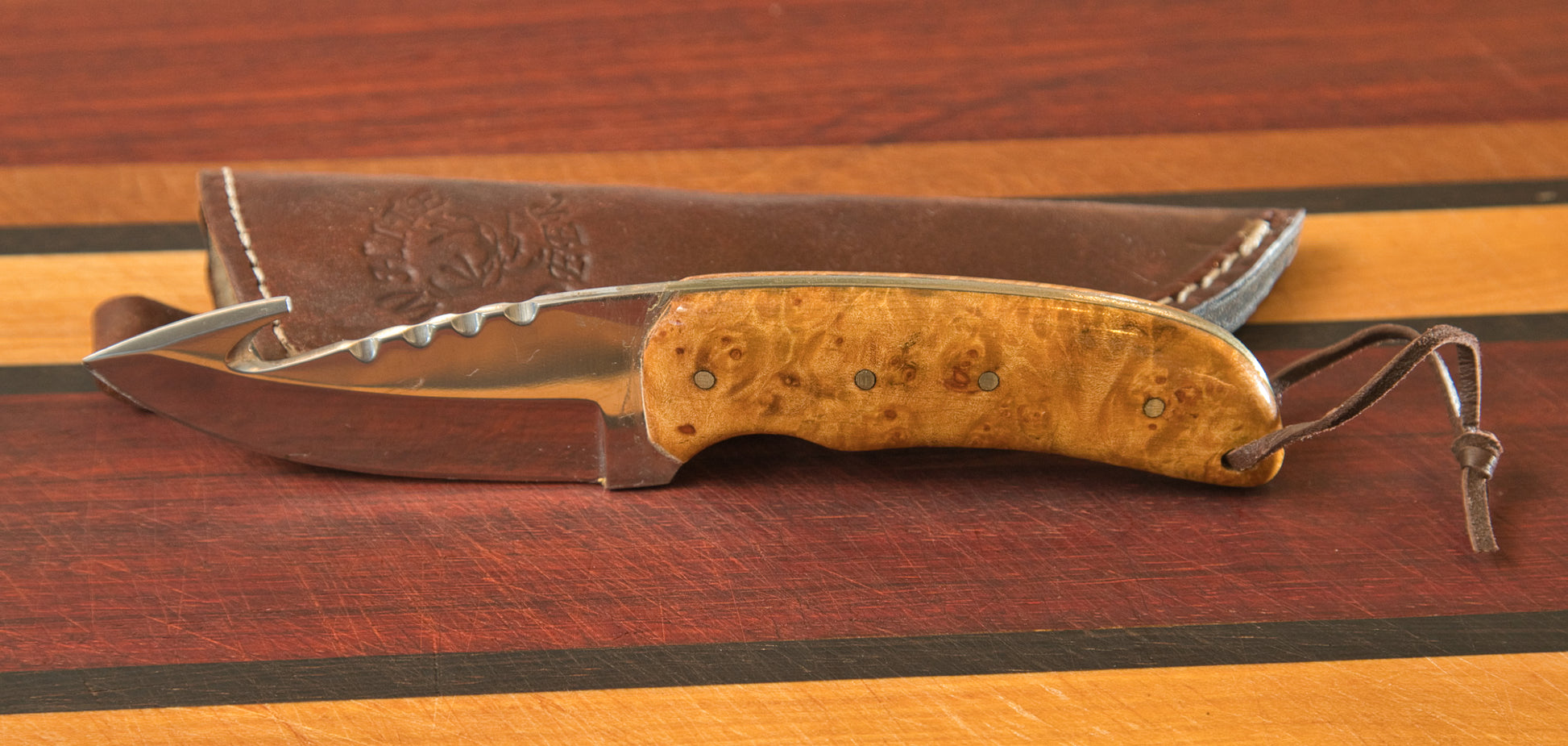 7" Burled Handle Knife with Gloss Blade and Sheath