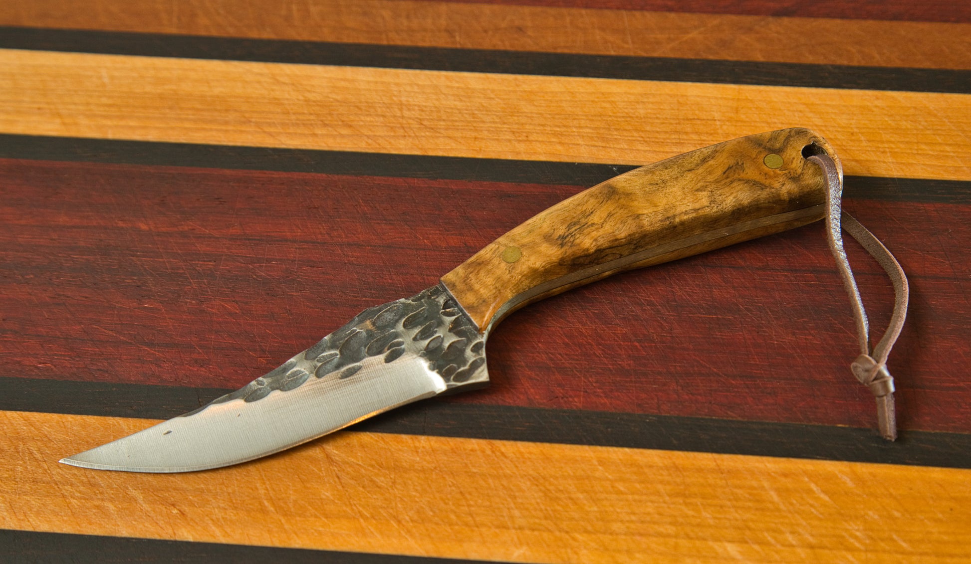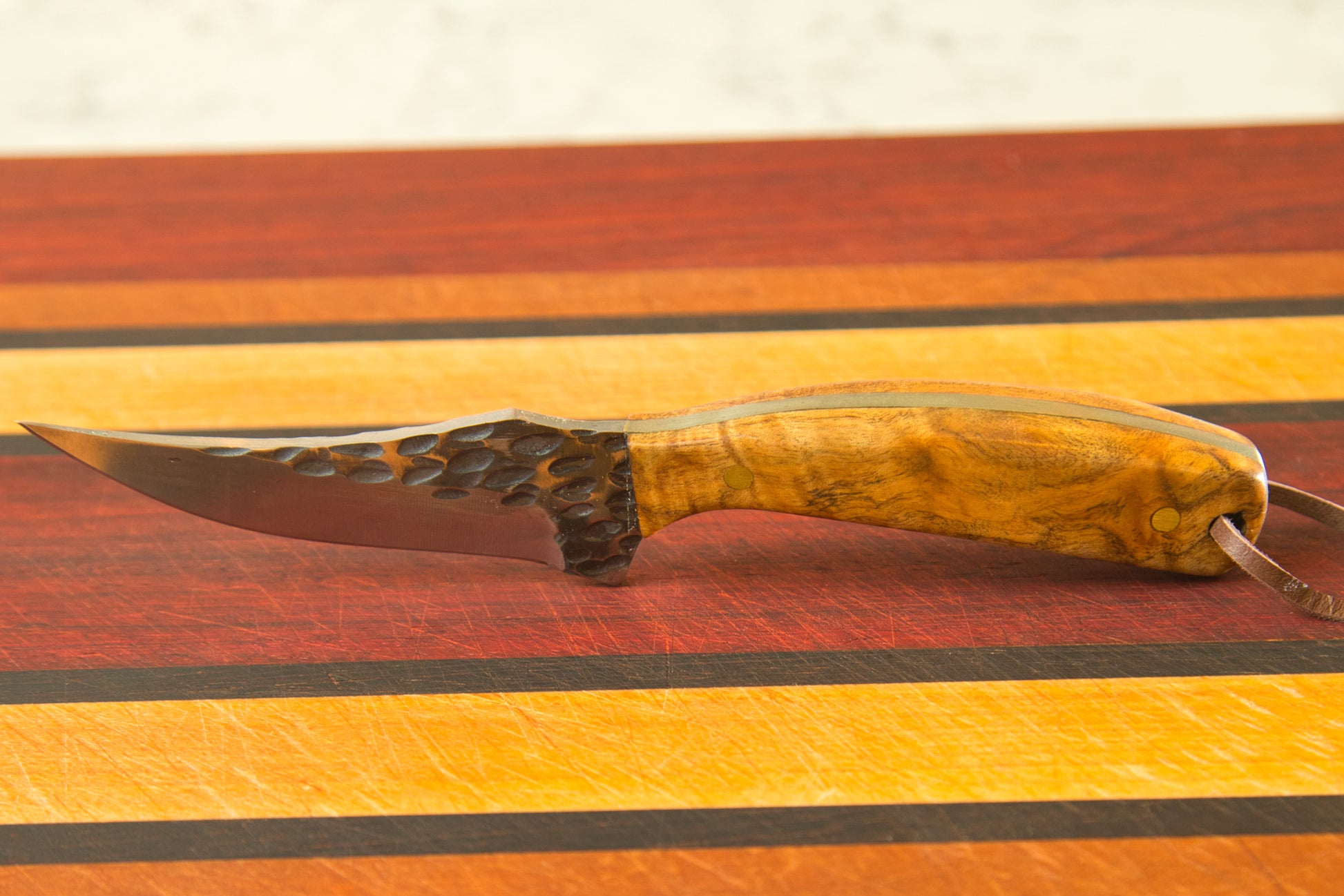 Crafted with precision and dedication, this knife showcases the artistry of combining exotic burled hardwood with unparalleled craftsmanship. Each edge of the handle is meticulously shaped to highlight the distinct grain of the exotic wood, creating a stunning visual experience. The blade, a masterpiece of hammered steel, not only captivates with its beauty but also boasts a decisively sharp edge, ready to tackle any task with ease. Firmly attached to the handle with great care and superior adhesives, reinforced by pins for added rigidity, this knife is not just a tool but a testament to the enduring quality and attention to detail of North Texas craftsmanship.