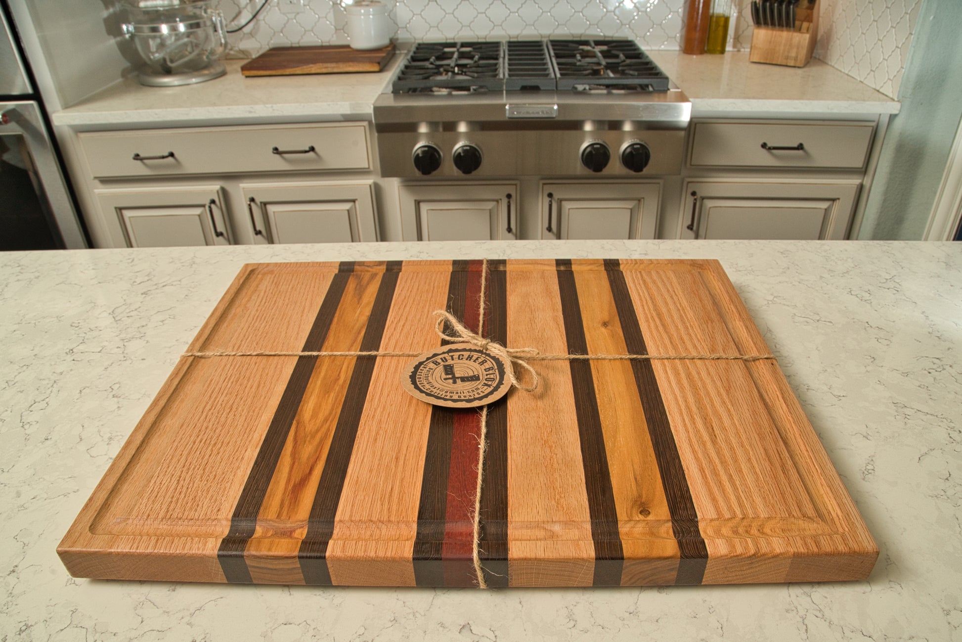 This beautiful oversize cutting board for brisket, or other cuts of meat measures 23"x17.75"x1.375", and is crafted from a blend of premium international and domestic hardwoods, is an essential tool for Pitmasters. Its ample size provides ample space for slicing and serving, while the combination of hardwoods ensures durability and resistance to wear, making it ideal for handling the rigors of barbecue preparation. Our boards are meant to be generational and passed down as the years go by.