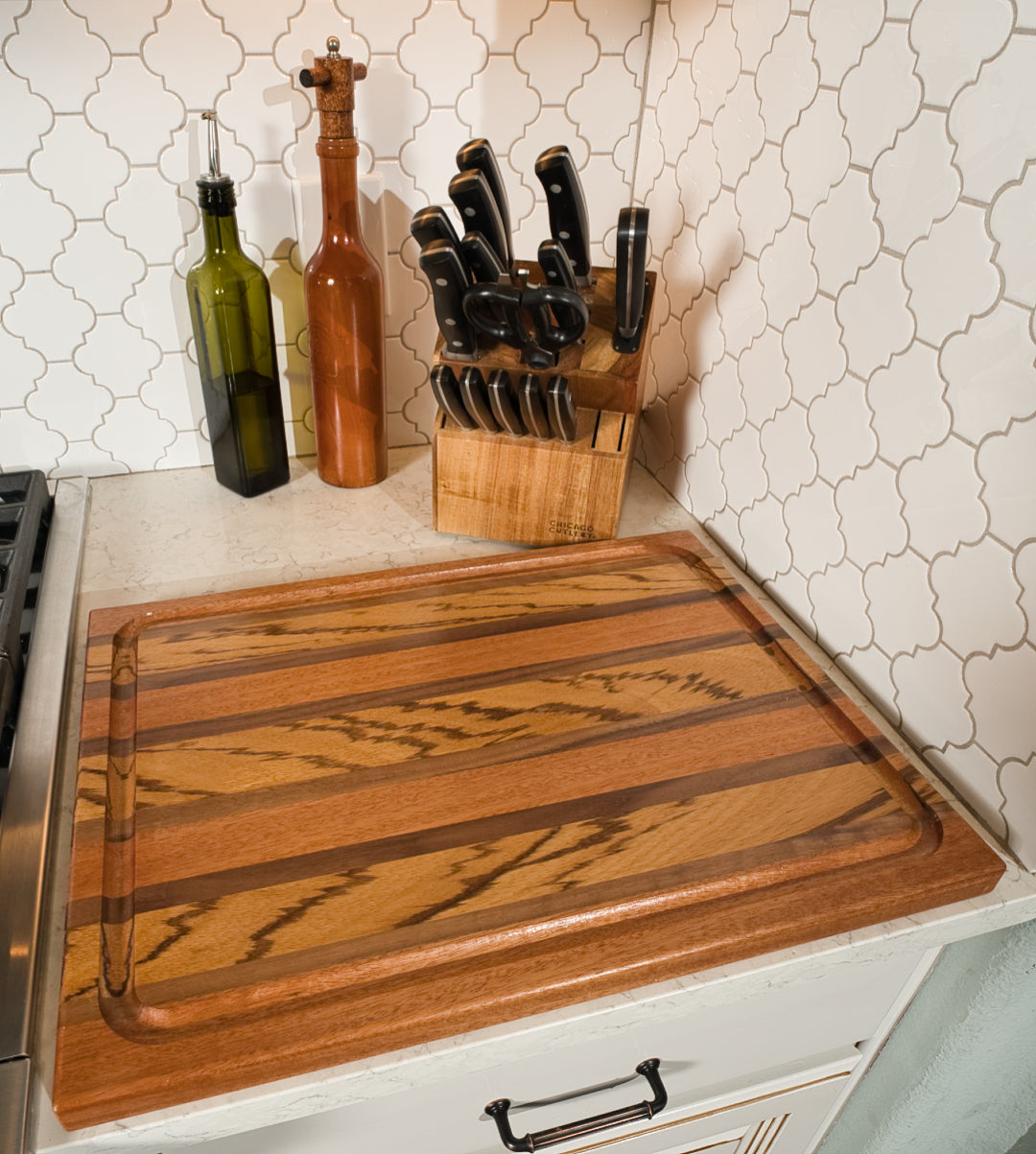 Stunning midsize kitchen cutting board, measuring 19"x15"x1" Meticulously crafted from a harmonious blend of premium international and domestic hardwoods, proudly handcrafted to perfection in the heart of North Texas. This exquisite board not only serves as a practical tool for meal prep but also doubles as a captivating centerpiece, showcasing the natural beauty of the wood grains. Built to exacting standards, it promises durability and longevity, destined to be a cherished heirloom in your kitchen for generations to come.