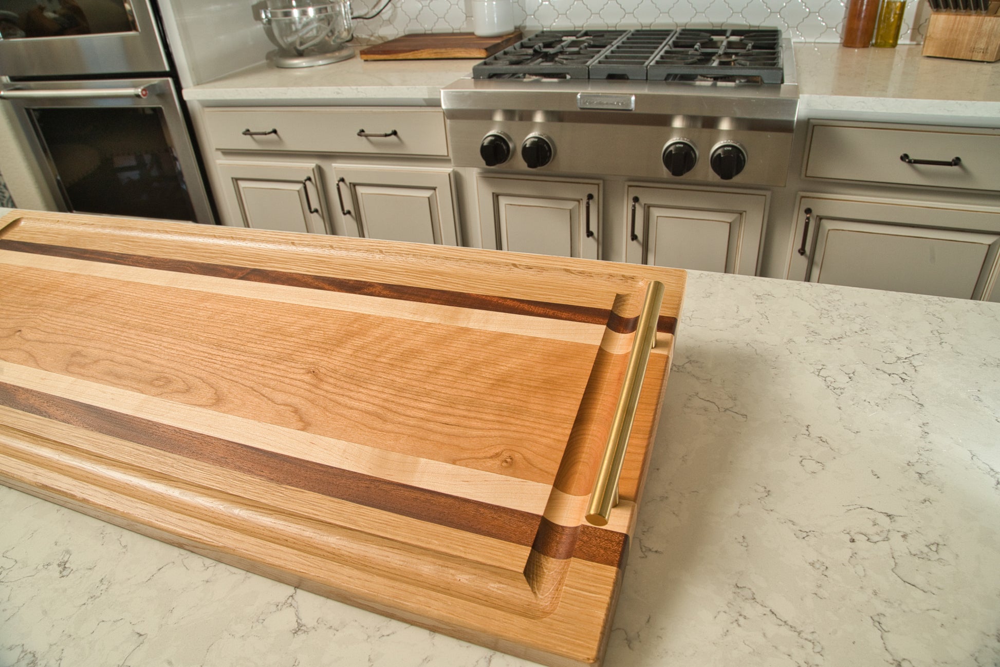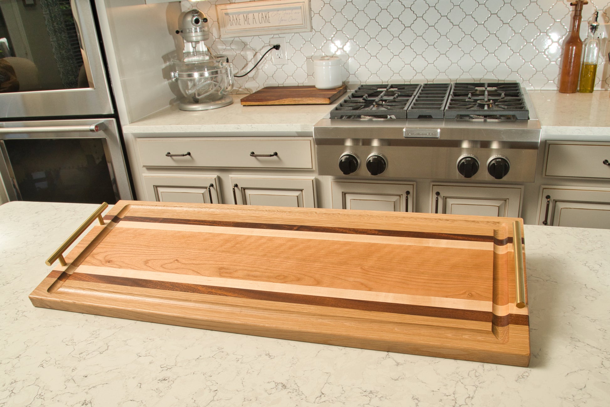 Introducing the ultimate cutting board designed specifically to fit perfectly on the front shelf of your pellet smoker. This design was derived from the front shelf on a Yoder 640 pellet smoker but we quickly identified that it will work with most pellet smokers that have a front shelf on them. Crafted with premium hardwoods, this board exudes both elegance and durability. The thoughtfully designed handles on each side ensure easy portability and handling. With a generous size of 31" x 12" x 1", it provides ample space for all your cutting and prepping needs. The 1-inch juice groove helps keep your workspace clean and tidy, capturing any excess liquids from meats and fruits. Elevate your grilling experience with this functional and stylish cutting board, making outdoor cooking a breeze.