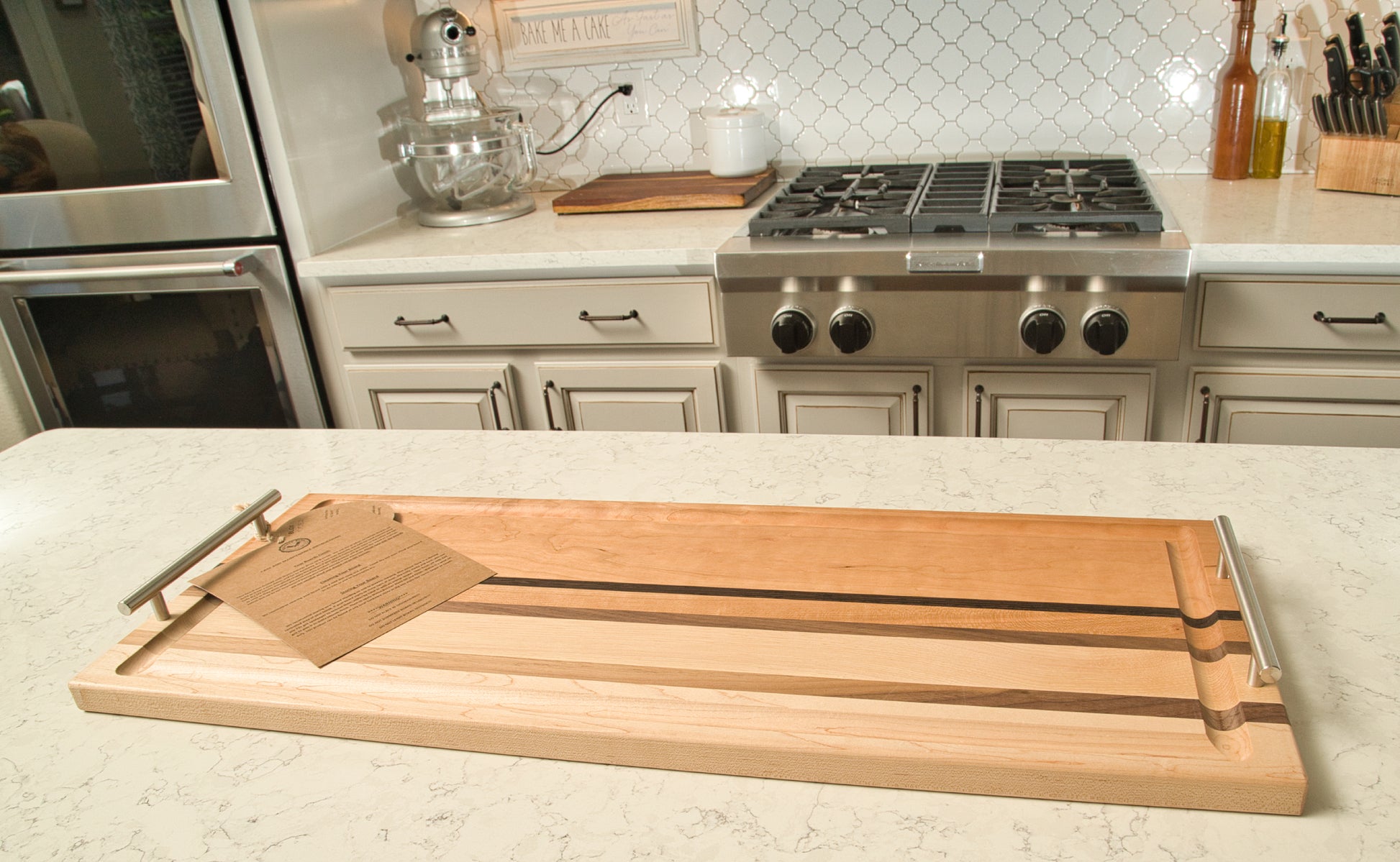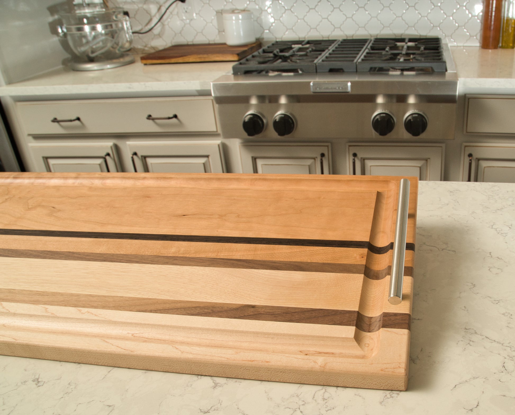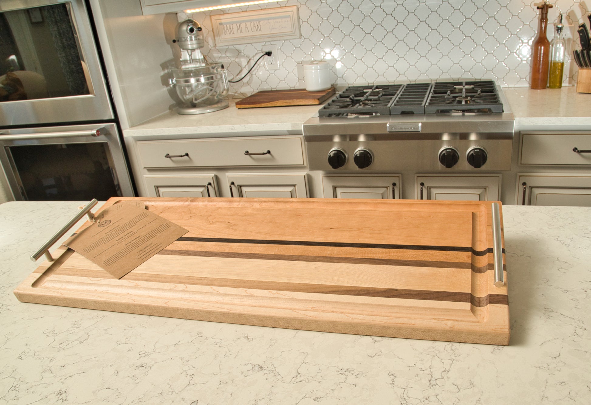 Introducing the ultimate cutting board designed specifically to fit perfectly on the front shelf of your pellet smoker. This design was derived from the front shelf on a Yoder 640 pellet smoker but we quickly identified that it will work with most pellet smokers that have a front shelf on them. Crafted with premium hardwoods, this board exudes both elegance and durability. The thoughtfully designed handles on each side ensure easy portability and handling. With a generous size of 31" x 12" x 1", it provides ample space for all your cutting and prepping needs. The 1-inch juice groove helps keep your workspace clean and tidy, capturing any excess liquids from meats and fruits. Elevate your grilling experience with this functional and stylish cutting board, making outdoor cooking a breeze.