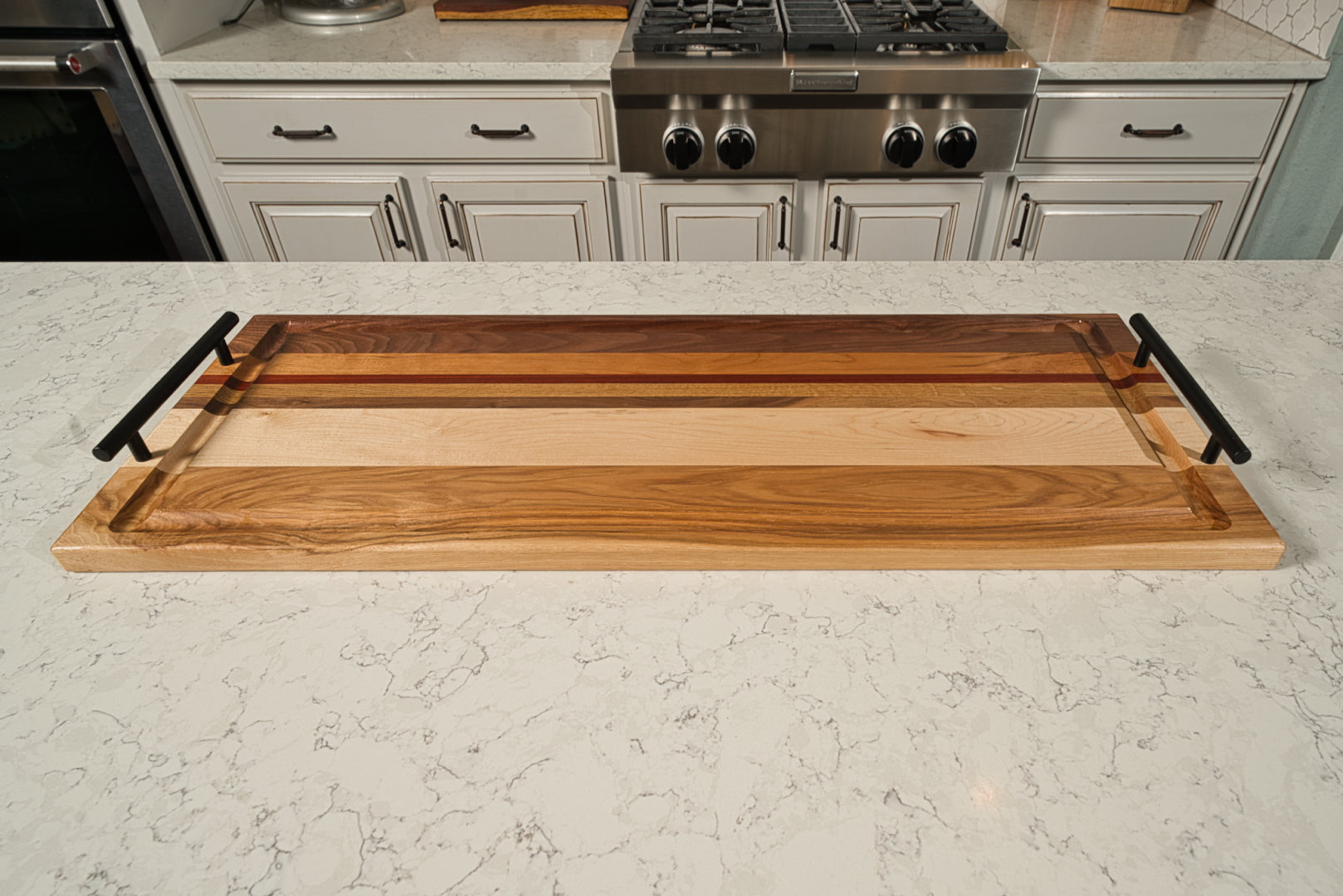 Introducing the ultimate cutting board designed specifically to fit perfectly on the front shelf of your pellet smoker. This design was derived from the front shelf on a Yoder 640 pellet smoker but we quickly identified that it will work with most pellet smokers that have a front shelf on them. (Please check to see if your smoker has a front shelf and will accomodate this sized board.) Crafted with premium hardwoods, this board exudes both elegance and durability. The thoughtfully designed handles on each side ensure easy portability and handling. With a generous size of 31" x 12" x 1", it provides ample space for all your cutting and prepping needs. The 1-inch juice groove helps keep your workspace clean and tidy, capturing any excess liquids from meats and fruits. Elevate your grilling experience with this functional and stylish cutting board, making outdoor cooking a breeze.