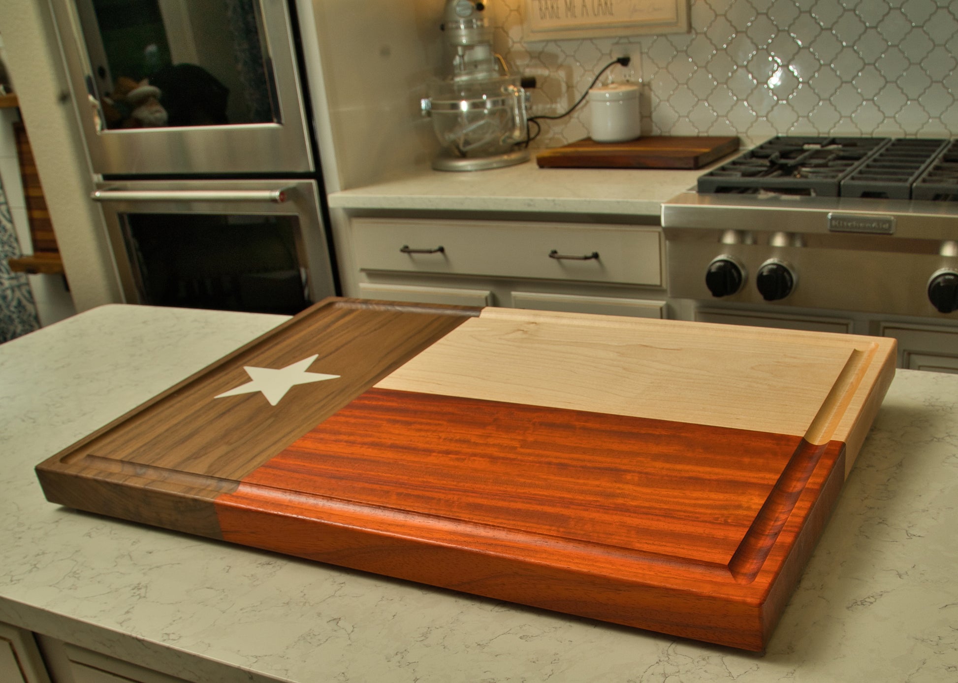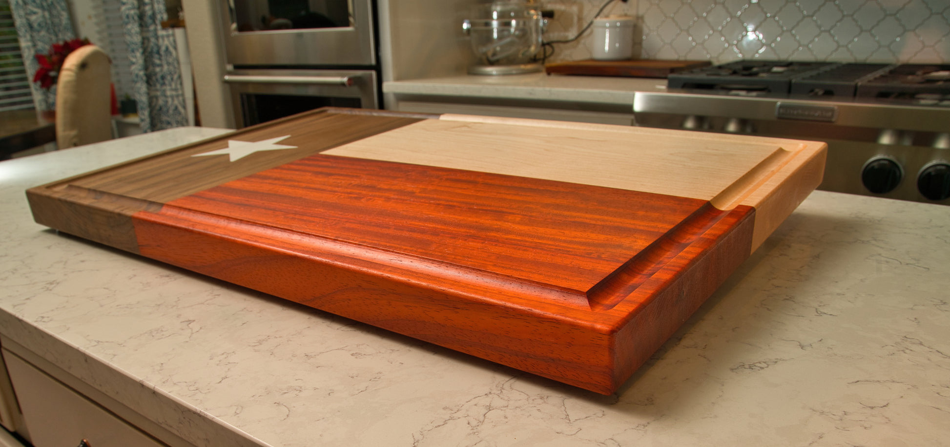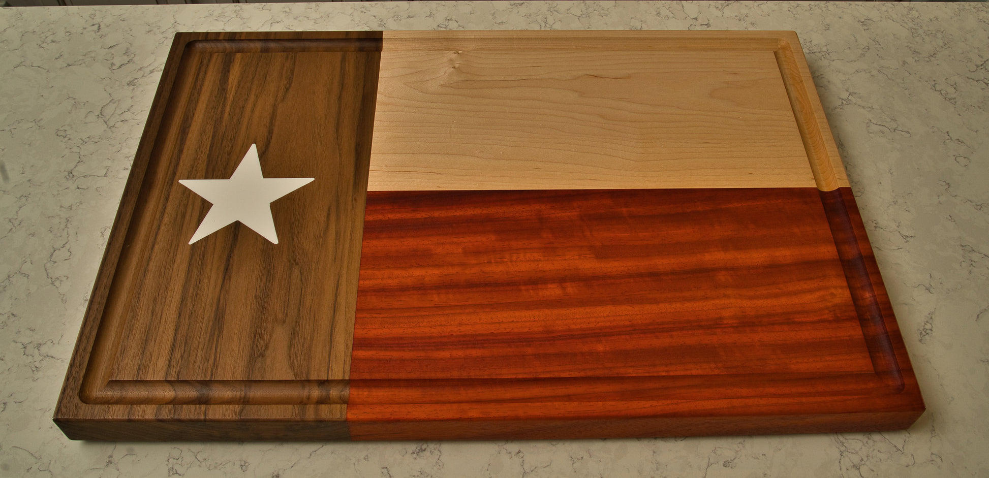 Presenting the native Texan inspired brisket board, meticulously handcrafted with a mix of dark walnut, hard maple, and Paduak hardwoods. Measuring 27 inches long, 18 inches wide, and 1 1/2 inches deep, this cutting board exudes both elegance and sturdiness. The focal point of the design is a captivating two-part epoxy white star, symbolizing the Lone Star State's iconic flag.